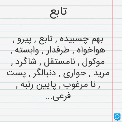 بهم چسبیده , تابع , پیرو , هواخواه , طرفدار , وابسته , موکول , نامستقل , شاگرد , مرید , حواری , دنبالگر , پست , نا مرغوب , پایین رتبه , فرعی , درجه دوم , مهر , نشان , نقش , باسمه , چاپ , تمبر , جنس , نوع , پابزمین کوبیدن , مهر زدن , نشان دار کردن , کلیشه زدن , نقش بستن , منقوش کردن , منگنه کردن , تمبرزدن , تمبر پست الصاق کردن , مادون , مرءوس , خرده مالک , کشاورز , مالک جزء