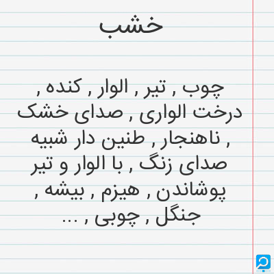 چوب , تیر , الوار , کنده , درخت الواری , صدای خشک , ناهنجار , طنین دار شبیه صدای زنگ , با الوار و تیر پوشاندن , هیزم , بیشه , جنگل , چوبی , درختکاری کردن , الوار انباشتن