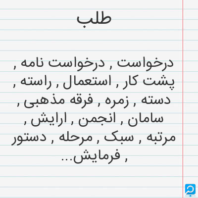 درخواست , درخواست نامه , پشت کار , استعمال , راسته , دسته , زمره , فرقه مذهبی , سامان , انجمن , ارایش , مرتبه , سبک , مرحله , دستور , فرمایش , حواله , خواهش , تقاضا , خواسته , خواستار شدن , تمنا کردن , تقاضا کردن