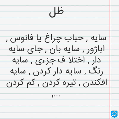 سایه , حباب چراغ یا فانوس , اباژور , سایه بان , جای سایه دار , اختلا ف جزءی , سایه رنگ , سایه دار کردن , سایه افکندن , تیره کردن , کم کردن , زیر وبم کردن , ظل , سایه افکندن بر , رد پای کسی را گرفتن , پنهان کردن