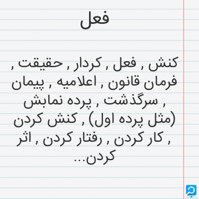 کنش , فعل , کردار , حقیقت , فرمان قانون , اعلامیه , پیمان , سرگذشت , پرده نمابش (مثل پرده اول) , کنش کردن , کار کردن , رفتار کردن , اثر کردن , بازی کردن , نمایش دادن , تقلید کردن , مرتکب شدن , به کار انداختن , کلمه , لغت , مربوط به صدا