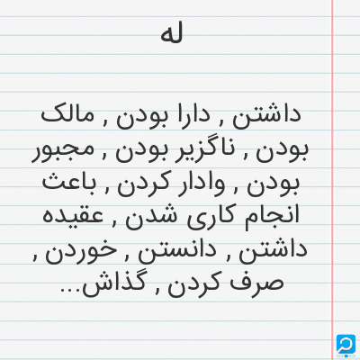 داشتن , دارا بودن , مالک بودن , ناگزیر بودن , مجبور بودن , وادار کردن , باعث انجام کاری شدن , عقیده داشتن , دانستن , خوردن , صرف کردن , گذاشتن , کردن , رسیدن به , جلب کردن , بدست اوردن , دارنده , مالک , ضمیر ملکی سوم شخص مفردمذکر , مال او (مرد) , مال انمرد , مال او , مال ان