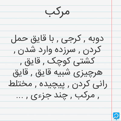 دوبه , کرجی , با قایق حمل کردن , سرزده وارد شدن , کشتی کوچک , قایق , هرچیزی شبیه قایق , قایق رانی کردن , پیچیده , مختلط , مرکب , چند جزءی , جسم مرکب , لفظ مرکب , بلور دوتایی () محوطه , عرصه , حیاط , ترکیب , ترکیب کردن , امیختن