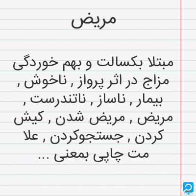 مبتلا بکسالت و بهم خوردگی مزاج در اثر پرواز , ناخوش , بیمار , ناساز , ناتندرست , مریض , مریض شدن , کیش کردن , جستجوکردن , علا مت چاپی بمعنی عمدا چنین نوشته شده , برانگیختن , بدحال , ناپاک