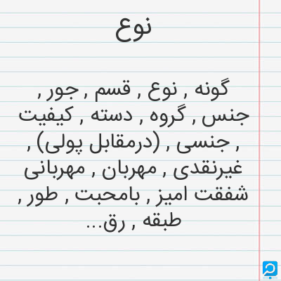 گونه , نوع , قسم , جور , جنس , گروه , دسته , کیفیت , جنسی , (درمقابل پولی) , غیرنقدی , مهربان , مهربانی شفقت امیز , بامحبت , طور , طبقه , رقم , جورکردن , سوا کردن , دسته دسته کردن , جور درامدن , پیوستن , دمساز شدن , بشر , انواع , حروف چاپ , ماشین تحریر , ماشین کردن