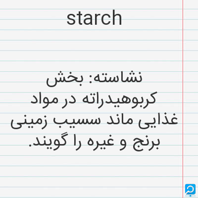 نشاسته: بخش کربوهیدراته در مواد غذایی ماند سسیب زمینی برنج و غیره را گویند.