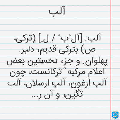 آلب. [آل ْب ْ / ل ِ] (ترکی، ص) بترکی قدیم، دلیر. پهلوان. و جزء نخستین بعض اعلام مرکبه ٔ ترکانست، چون آلب ارغون، آلب ارسلان، آلب تگین، و آن را اَلْب نیز گویند.