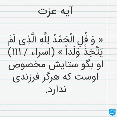 « وَ قُلِ الْحَمْدُ لِلَّهِ الَّذِی لَمْ یَتَّخِذْ وَلَداً » (اسراء / 111) او بگو ستایش مخصوص اوست که هرگز فرزندی ندارد.