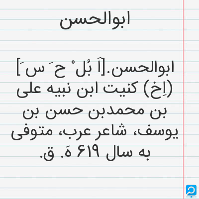 ابوالحسن.[اَ بُل ْ ح َ س َ] (اِخ) کنیت ابن نبیه علی بن محمدبن حسن بن یوسف، شاعر عرب، متوفی به سال 619 هَ. ق.