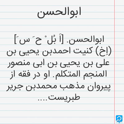 ابوالحسن. [اَ بُل ْ ح َ س َ] (اِخ) کنیت احمدبن یحیی بن علی بن یحیی بن ابی منصور المنجم المتکلم. او در فقه از پیروان مذهب محمدبن جریر طبریست. (ابن الندیم).