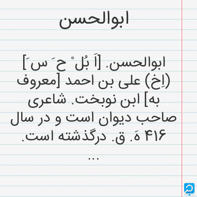 ابوالحسن. [اَ بُل ْ ح َ س َ] (اِخ) علی بن احمد [معروف به] ابن نوبخت. شاعری صاحب دیوان است و در سال 416 هَ. ق. درگذشته است.