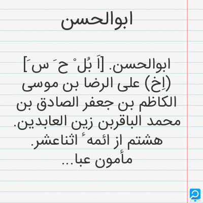 ابوالحسن. [اَ بُل ْ ح َ س َ] (اِخ) علی الرضا بن موسی الکاظم بن جعفر الصادق بن محمد الباقربن زین العابدین. هشتم از ائمه ٔ اثناعشر. مأمون عباسی به سال 202 هَ. ق. دختر خود ام حبیب را بزنی بوی داد و او را ولیعهد خویش خواند و نام وی بر درم و دینار سکه کرد. ولادت علی رضا به روز جمعه از سال 153 بمدینه ٔ رسول بود و بعضی به سال 151 گفته اند و وفات او در آخر صفر 202 یا سیزدهم ذیقعده ٔ 203 در شهر طوس روی داد. و مأمون بر او نماز گزارد و پهلوی قبر پدر مأمون، هرون الرشید جسد مطهر او بخاک سپردند. و گویندمأمون حضرت را به سم شهید کرد. رجوع به رضا شود.