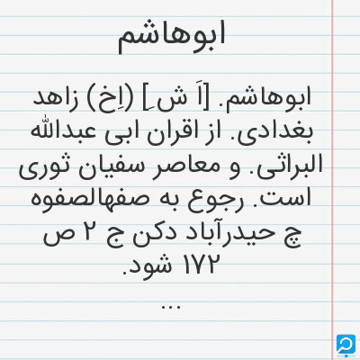 ابوهاشم. [اَ ش ِ] (اِخ) زاهد بغدادی. از اقران ابی عبداﷲ البراثی. و معاصر سفیان ثوری است. رجوع به صفهالصفوه چ حیدرآباد دکن ج 2 ص 172 شود.