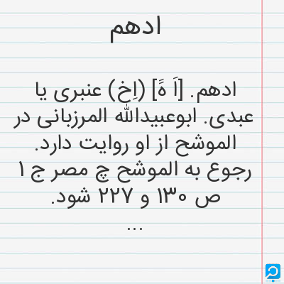ادهم. [اَ هََ] (اِخ) عنبری یا عبدی. ابوعبیداﷲ المرزبانی در الموشح از او روایت دارد. رجوع به الموشح چ مصر ج 1 ص 130 و 227 شود.