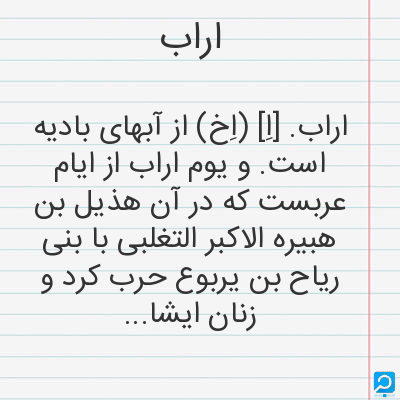 اراب. [اِ] (اِخ) از آبهای بادیه است. و یوم اراب از ایام عربست که در آن هذیل بن هبیره الاکبر التغلبی با بنی ریاح بن یربوع حرب کرد و زنان ایشان را برده گرفت و چارپایان ایشان ببرد. مساوربن هند گوید: