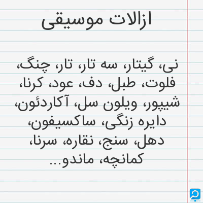 نی، گیتار، سه تار، تار، چنگ، فلوت، طبل، دف، عود، کرنا، شیپور، ویلون سل، آکاردئون، دایره زنگی، ساکسیفون، دهل، سنج، نقاره، سرنا، کمانچه، ماندولین، چگور