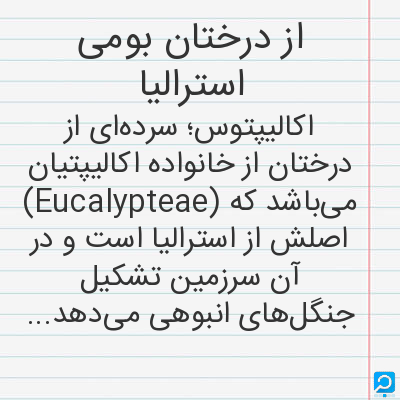 اکالیپتوس؛ سردهای از درختان از خانواده اکالیپتیان (Eucalypteae) میباشد که اصلش از استرالیا است و در آن سرزمین تشکیل جنگلهای انبوهی میدهد و ارتفاع آن از ۳۰ میلیمتر به ۱۴۵ متر و محیط تنه آن به ۲۵ متر میرسد. چوب این درخت بسیار سخت و در برابر پوسیدگی مقاوم است. پوست آن رنگ قهوهای مایل به زرد دارد و به راحتی از ساقه جدا میشود. رنگ برگ آن نیز بسته به سن درخت (در آغاز سبز مایل به آبی و به مرور زمان سبز مایل به سفید) است.