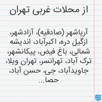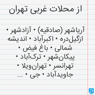 آریاشهر (صادقیه)، آزادشهر، ازگیل دره، اکبرآباد، اندیشه شمالی، باغ فیض، پیکانشهر، ترک آباد، تهرانسر، تهران ویلا، جاویدآباد، جی، حسن آباد، حصارک، خلیج، دریان نو، دهکده المپیک، زیبا دشت، زیبا دشتک، زیبا شهر، سرآسیاب مهرآباد، سعادت آباد، سعید آباد، سنگچشمه، شادآباد، شهاب شهر، شهر زیبا، شهرآرا، شهران، شهرک غرب، ضرابخانه، طرشت، عرب آباد، کَن، کهک، گلستان، مرادآباد، مهرآباد، نوروزآباد، وردآورد، وسک، ویلاشهر، یافت آباد