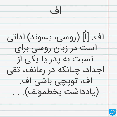 اف. [اُ] (روسی، پسوند) اداتی است در زبان روسی برای نسبت به پدر یا یکی از اجداد، چنانکه در رمانف، تقی اف، توپچی باشی اف. (یادداشت بخطمؤلف). زاده. پور. منسوب: تقی اف، یعنی تقی زاده.