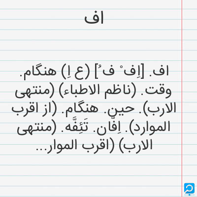اف. [اِف ْ ف ُ] (ع اِ) هنگام. وقت. (ناظم الاطباء) (منتهی الارب). حین. هنگام. (از اقرب الموارد). اِفّان. تَئِفَّه. (منتهی الارب) (اقرب الموارد). گویند: کان ذلک علی افه و افّانه، یعنی وقت و هنگامش بود. (منتهی الارب) (ناظم الاطباء).