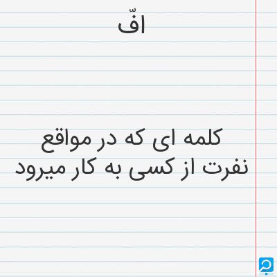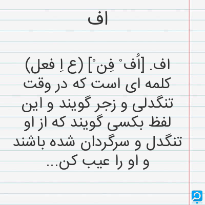 اف. [اُف ْ فِن ْ] (ع اِ فعل) کلمه ای است که در وقت تنگدلی و زجر گویند و این لفظ بکسی گویند که از او تنگدل و سرگردان شده باشند و او را عیب کنند. (آنندراج). کلمه ٔ کراهت است و در آن چهل لغت آمده: اُف ﱡ. اُف َّ. اُف ِّ. اُف ﱡ. اُفّاً و اُف ه. اُف ُ و اُف َ و اُف ِ و اُف ٌ و اُفاً و اُف و اُفّی بدون اماله و اُفّی به اماله ٔ محض و اُفِّی به اماله ٔ بین بین و الف در هر سه لغت برای تأنیث است. و اُفِّی به کسر الفاء و اُفّوُه ُو اُفﱡه ُ و اُفَّه ُ. اُفِّه ِ. اِف. اِف ﱡ. اِف ِ. اِف.اِفاً. اِف. اِف ٌ. اِفاً. اِف. اِف ٌ. اِفی ̍. اِفّی. اِفّی به اماله و اِفّی. اَف ِّ. اِف. اَف ّ. آف ّ. اَف. آف. اُف. اَف. (منتهی الارب) (ناظم الاطباء). کلمه ای است که بر تنگدلی و کراهت دلالت دارد و در آن لغاتی است که این صورت از همه مشهورتر است. (از اقرب الموارد). صوتی است که تکلم کرده می شود بدان نزدیک کاری که دشوار نماید و در وقت تنگدلی و زجر گویند و کلمه ای است که بجهت اهانت کسی گویند. (ترجمان القرآن ترتیب عادل بن علی). هنگام کراهت گویند. (زمخشری). کلمه ای است برای نفرین. کلمه ای است که بعلامت ضجرت گویند.کلمه ای نمودن ضجرت را. کلمه ای برای نمودن کراهت است. (یادداشت بخط مؤلف): و لاتقل لهما اف و لاتنهرهما. (قرآن 23/17). || (اِ) هر چیز حقیر از چوب و نی و جز آن که آنرا از زمین بردارند. و منه: افا له و تفاً؛ ای قذرا له. (منتهی الارب) (ناظم الاطباء) (از آنندراج). آلودگی و ناپاکی. افاً له و علیه، ای قذراً. (از اقرب الموارد). || تراشه ٔ ناخن یا چرک آن یا چرک گوش. (منتهی الارب) (آنندراج) (ناظم الاطباء). || چرک گوش. (از اقرب الموارد). زهره ٔ گوش. (مهذب الاسماء نسخه ٔ خطی). برخی گفته اند: اف، چرک گوش و تف، چرک ناخن است. (ناظم الاطباء) (آنندراج) (منتهی الارب). یا اف بمعنی قلت است و تف از اتباع است. (منتهی الارب) (آنندراج) (ناظم الاطباء).