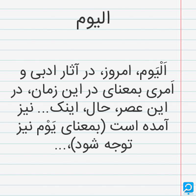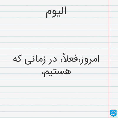 اَلْیَوم، امروز، در آثار ادبی و اَمری بمعنای در این زمان، در این عصر، حال، اینک... نیز آمده است (بمعنای یَوْم نیز توجه شود)،