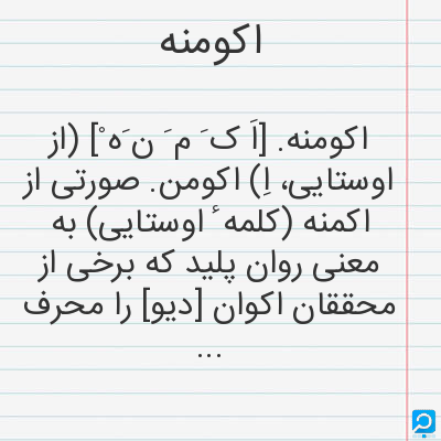 اکومنه. [اَ ک َ م َ ن َه ْ] (از اوستایی، اِ) اکومن. صورتی از اکمنه (کلمه ٔ اوستایی) به معنی روان پلید که برخی از محققان اکوان [دیو] را محرف آن دانند. (از مزدیسنا و ادب پارسی ذیل ص 163). رجوع به اکمنه شود.