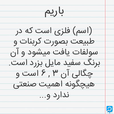 (اسم) فلزی است که در طبیعت بصورت کربنات و سولفات یافت میشود و آن برنگ سفید مایل بزرد است. چگالی آن 6 , 3 است و هیچگونه اهمیت صنعتی ندارد و مانند کلسیم آبرا باسانی تجزیه می کند. و از غیر محلول ترین اجسام است و چون اشعه ایکس از آن نمیگذرد در عکس براداری از روده ها از آن استفاده میشود یعنی مقدار نسبه زیادی از آنرا به بیمار میخورانند و آن داخل روده ها را اندوه کرده در زیر اشعه بصورت کدری آشکار میگردد. برای تهیه باریوم فلزی کلرور باریوم گداخته را در اثر روان کردن برق تجزیه میکنند.
