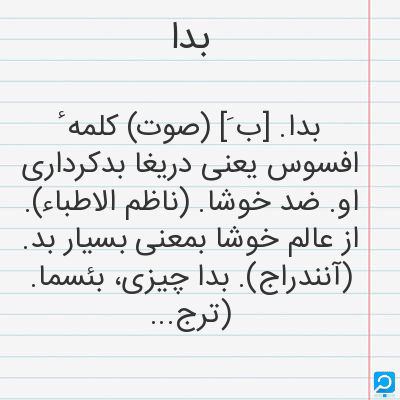 بدا. [ب َ] (صوت) کلمه ٔ افسوس یعنی دریغا بدکرداری او. ضد خوشا. (ناظم الاطباء). از عالم خوشا بمعنی بسیار بد. (آنندراج). بدا چیزی، بئسما. (ترجمان القرآن جرجانی). بدا بحال من، وای بر من. بدا بحال کسی... وای ِ کسی که...، وای بر کسی که... (یادداشت مؤلف):