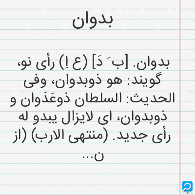 بدوان. [ب َ دَ] (ع اِ) رأی نو، گویند: هو ذوبدوان، وفی الحدیث: السلطان ذوعَدَوان و ذوبدوان، ای لایزال یبدو له رأی جدید. (منتهی الارب) (از ناظم الاطباء).