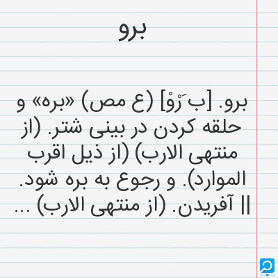 برو. [ب َرْوْ] (ع مص) «بره» و حلقه کردن در بینی شتر. (از منتهی الارب) (از ذیل اقرب الموارد). و رجوع به بره شود. || آفریدن. (از منتهی الارب) (المصادر زوزنی) (تاج المصادر بیهقی). برء. و رجوع به برء شود. || تراشیدن تیر و چوب و قلم و مانند آن. (از منتهی الارب). بری. و رجوع به بری شود. || از بیماری به شدن. (المصادر زوزنی) (از تاج المصادر بیهقی). برء. و رجوع به برء شود.