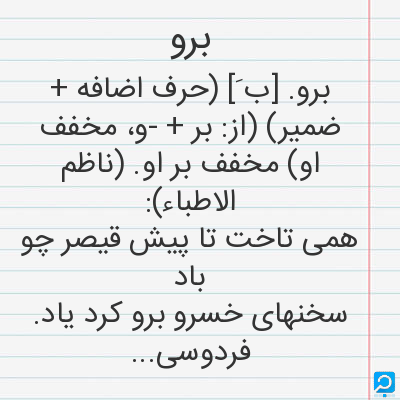 برو. [ب َ] (حرف اضافه + ضمیر) (از: بر + -و، مخفف او) مخفف بر او. (ناظم الاطباء):