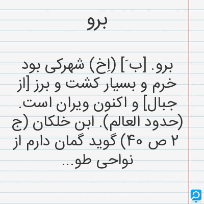 برو. [ب َ] (اِخ) شهرکی بود خرم و بسیار کشت و برز [از جبال] و اکنون ویران است. (حدود العالم). ابن خلکان (ج 2 ص 40) گوید گمان دارم از نواحی طوس باشد.