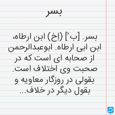 بسر. [ب ُ] (اِخ) ابن ارطاه، ابن ابی ارطاه. ابوعبدالرحمن از صحابه ای است که در صحبت وی اختلاف است. بقولی در روزگار معاویه و بقول دیگر در خلافت ولید بسال 86 هَ. ق. درگذشته است. (از الاصابه باختصار). و رجوع به همین کتاب ج 1 ص 152 و 153 و منتهی الارب و قاموس الاعلام ترکی ج 2 و اعلام زرکلی و تاریخ اسلام ص 151 والبیان والتبین ج 2 ص 43 و تمدن جرجی زیدان ج 4 ص 82 و عقدالفرید ج 4 ص 89 و ج 6 ص 125 و حبیب السیر چ خیام ج 1 شود.