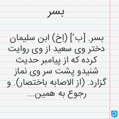 بسر. [ب ُ] (اِخ) ابن سلیمان دختر وی سعید از وی روایت کرده که از پیامبر حدیث شنیدو پشت سر وی نماز گزارد. (از الاصابه باختصار). و رجوع به همین کتاب ج 1 ص 154 و قاموس الاعلام ترکی شود.