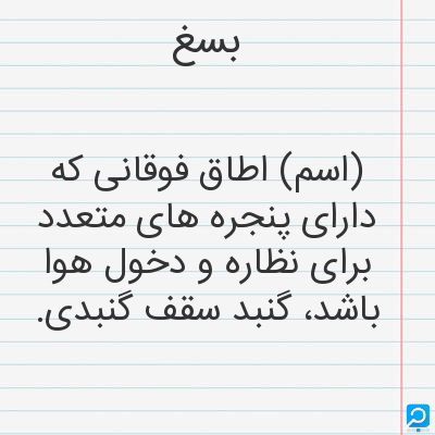 بسغ. [ب َ س َ] (اِ) اطاق فوقانی که دارای پنجره های متعدد برای نظاره و دخول هوا باشد. (ناظم الاطباء). و رجوع به شعوری ج 1 ورق 170شود. || گنبد و سقف گنبدی. (ناظم الاطباء).