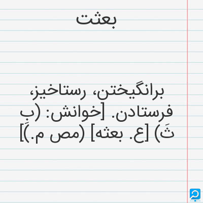 برانگیختن، رستاخیز، فرستادن. [خوانش: (بِ ثَ) [ع. بعثه] (مص م.)]