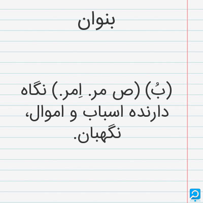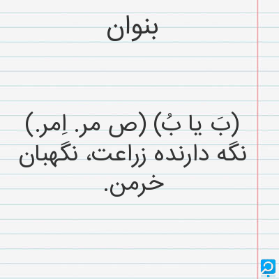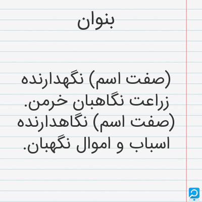 بنوان. [ب َ / ب ُ] (اِ مرکب، ص مرکب) مرکب از بن + وان. (برهان) (حاشیه ٔ برهان چ معین). نگهدارنده ٔ زراعت و نگهبان خرمن. (برهان) (آنندراج). نگاهبان خرمن. خرمن بان. (شرفنامه ٔ منیری). سرکار کشت و زراعت. (ناظم الاطباء). دشت بان. نگاهبان کشت و خرمن. || نگاهدارنده ٔ اسباب و اموال. (برهان). نگهبان اموال و اسباب. (آنندراج). نگاهدارنده ٔ اسباب و اموال. نگهبان. (فرهنگ فارسی معین).