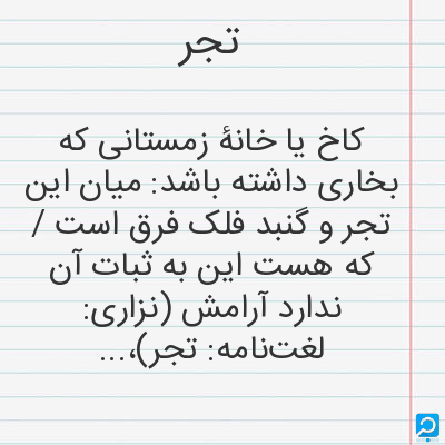 کاخ یا خانۀ زمستانی که بخاری داشته باشد: میان این تجر و گنبد فلک فرق است / که هست این به ثبات آن ندارد آرامش (نزاری: لغتنامه: تجر)،