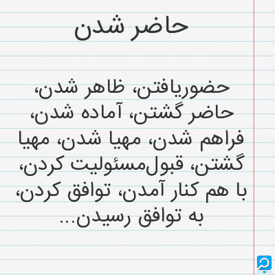 حضوریافتن، ظاهر شدن، حاضر گشتن، آماده شدن، فراهم شدن، مهیا شدن، مهیا گشتن، قبولمسئولیت کردن، با هم کنار آمدن، توافق کردن، به توافق رسیدن