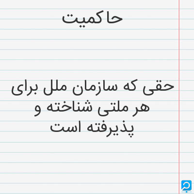 - حق حاکمیت ملی، حقی که سازمان ملل برای هر ملتی شناخته و پذیرفته است، و به موجب آن باید ملتها بر سرنوشت خود مسلط باشند و هیچ ملتی حق مداخله در تعیین سرنوشت ملت دیگر ندارد.