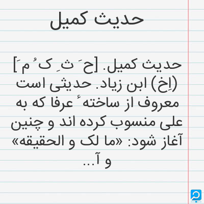 حدیث کمیل. [ح َ ث ِ ک ُ م َ] (اِخ) ابن زیاد. حدیثی است معروف از ساخته ٔ عرفا که به علی منسوب کرده اند و چنین آغاز شود: «ما لک و الحقیقه» و آنرا شرحها نوشته اند.