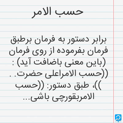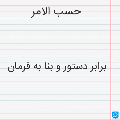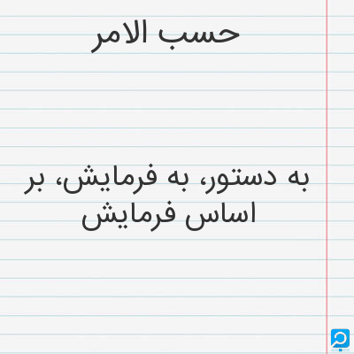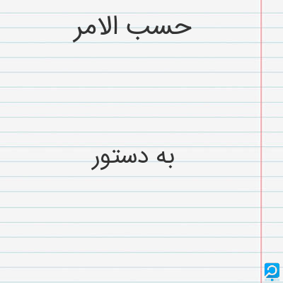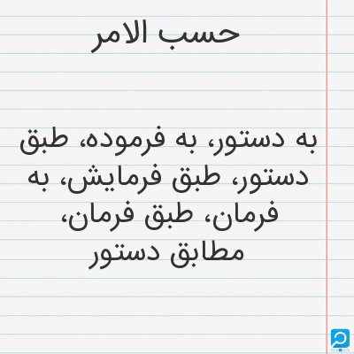 برابر دستور به فرمان برطبق فرمان بفرموده از روی فرمان (باین معنی باضافت آید) : ((حسب الامراعلی حضرت. . ))، طبق دستور: ((حسب الامربقورچی باشی پیوسته برسر آخسقه رفتند. ))