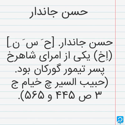 حسن جاندار. [ح َ س َ ن ِ] (اِخ) یکی از امرای شاهرخ پسر تیمور گورکان بود. (حبیب السیر چ خیام ج 3 ص 445 و 565).