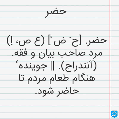 حضر. [ح َ ض ُ] (ع ص، اِ) مرد صاحب بیان و فقه. (آنندراج). || جوینده ٔ هنگام طعام مردم تا حاضر شود.