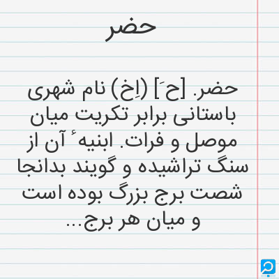 حضر. [ح َ] (اِخ) نام شهری باستانی برابر تکریت میان موصل و فرات. ابنیه ٔ آن از سنگ تراشیده و گویند بدانجا شصت برج بزرگ بوده است و میان هر برج با برجی دیگر نه برج کوچک و در مقابل هر برج قصری و حمامی و به رود ثرثارآبیاری می شده است و آن نهری عظیم است و بر ساحل آن قریه و باغهای بسیاری. ماده ٔ این رود از هرماس، رود نصیبین است و در آن کشتی می رانده اند. یاقوت گوید: لکن در زمان ما از آن شهر جز اثر باره و آثاری دیگر که بر عظمت و جلالت آن گواهان زنده اند چیزی بر جای نیست و ملک حضر را ساطرون می نامیدند و شاپور الجنود دیری آن شهر را در محاصره داشت و در آخر آنگاه که نضیره دختر ساطرون شیفته ٔ او گردید بوسیله ٔ او شهر را فتح و تسخیر کرد. (از معجم البلدان). و بزمان اشکانیان طراژان و سپتم سور امپراطوران روم بدانجا لشکر کشیدندلکن هر دو از فتح و تسخیر آن عاجز آمدند. رجوع به ایران باستان ج 3 شود. و صاحب قاموس گوید: و در هشتادوپنج هزارگزی جنوب موصل به جزیره بساحل یمین رود ثرثارشهری جسیم از آثوریان است و تحریات حفریات، چنانکه باید هنوز بدانجا بعمل نیامده است. قلقشندی گوید تیره ای از بطن ساعده در آن اقامت داشتند. (صبح الاعشی ج 1 ص 324). ناجی الاصیل باستان شناس عراقی در 1954 م. در خرابه های این شهر بکشفیاتی نائل آمد. (اعلام المنجد).