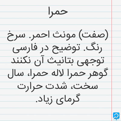 (صفت) مونث احمر. سرخ رنگ. توضیح در فارسی توجهی بتانیث آن نکنند گوهر حمرا لاله حمرا، سال سخت، شدت حرارت گرمای زیاد.