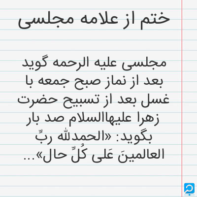 مجلسی علیه الرحمه گوید بعد از نماز صبح جمعه با غسل بعد از تسبیح حضرت زهرا علیهاالسلام صد بار بگوید: «الحمدلله ربِّ العالمینَ عَلی کُلِّ حال» و صد صلوات فرستند و در حین ختم با کسی سخن نگوید، مجرب است که حاجتش روا شود. (رهنمای گرفتاران)