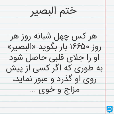هر کس چهل شبانه روز هر روز ۱۶۶۵۰ بار بگوید «البصیر» او را جلای قلبی حاصل شود به طوری که اگر کسی از پیش روی او گذرد و عبور نماید، مزاج و خوی و بلکه نام او را هم بداند. و به جمیع مرادات دین و دنیا و صفای ظاهر و باطن برسد و کارهای پریشان او جمع گردد و شرط آن کم خوردن و کم خفتن و نظر از محارم پوشیدن و در خلوت بودن است.
