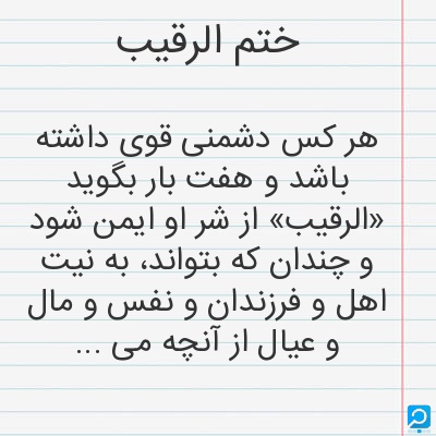 هر کس دشمنی قوی داشته باشد و هفت بار بگوید «الرقیب» از شر او ایمن شود و چندان که بتواند، به نیت اهل و فرزندان و نفس و مال و عیال از آنچه می ترسد، ایمن شود و از آفات و بلیات سالم ماند.